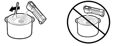 當(dāng)使用非接觸測(cè)量模式進(jìn)行測(cè)溫時(shí),為準(zhǔn)確測(cè)量液體及半液體,如 湯、辣椒醬、沙拉醬等的溫度,應(yīng)先攪動(dòng)液體,以將內(nèi)部溫度帶至 表面。蒸汽、塵土、煙霧等會(huì)干擾被測(cè)目標(biāo)放射的能量,從而影響 測(cè)溫的精度。為提高測(cè)量可靠性,不可使儀器直接在有蒸汽或煙霧 的產(chǎn)品上方進(jìn)行測(cè)量,而應(yīng)將儀器以一定的角度保持在稍后的位置, 以確保*精確的測(cè)量。
