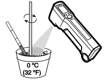 3. 用吸管或調(diào)酒棒繼續(xù)攪動(dòng)冰水,并同時(shí)用參考探針和 IR 紅外溫度計(jì)進(jìn)行測(cè)溫。儀器必須位于離水面 3 英寸之內(nèi) 。為確保測(cè)量精度,探針末端至少應(yīng)浸入水中 12 mm (1/2")。