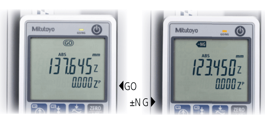 通過設(shè)置上、下限公差,進行 GO/±NG 判斷。 判斷結(jié)果超出公差范圍時,顯示器背光從綠 色變?yōu)榧t色,公差判斷一目了然。