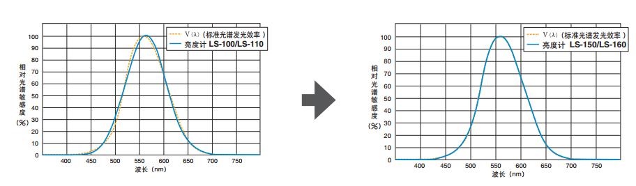 LS-150/LS-160 的傳感器高度吻合人眼的標(biāo)準(zhǔn)光譜視覺(jué)效率曲線 V(λ) ,同傳統(tǒng)亮度計(jì)相比,能夠測(cè)量出更接近人眼敏感度的 理想值。