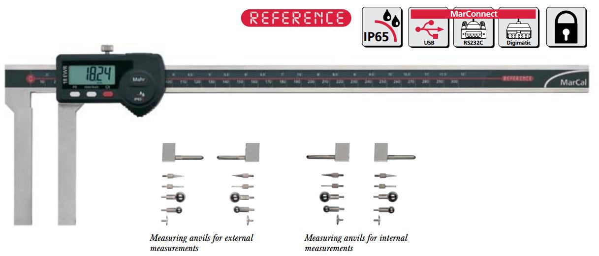 數(shù)字車間測徑規(guī), IP 65, 數(shù)據(jù)接口, 帶測量葉片,帶有絕對零點系統(tǒng),可立刻進行測量,具有出色的防護功能,防塵、冷卻液、潤滑油等,防護等級達IP65,*大移動速度2.5m/s,高對比度顯示屏,字符高度10mm(僅限300mm)和12.5mm,帶有滑動防塵板,電池壽命高達3年。尺框和主尺由不銹鋼淬硬制成。