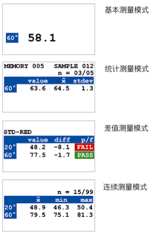 智能測量模式滿足不同任務(wù)的需要 不同的工作需要不同的工具。使用儀器上的滾輪能簡單快速 地顯示所需功能-甚至無需通過電腦: 基本測量模式可為您快速簡單地測量少量樣品的工具。 統(tǒng)計(jì)測量模式并不僅僅顯示平均值,而且統(tǒng)計(jì)數(shù)據(jù)可用于判 斷是否有測量誤差或者用于樣品的均質(zhì)性判定。您可自定義 所有想看到的數(shù)據(jù):平均值,標(biāo)準(zhǔn)偏差,范圍,*大值/*小 值.. 差值模式允許您定義一個(gè)帶有合格/不合格允差的參考值,所 有實(shí)測值將與所選擇的參考值進(jìn)行對比。合格/不合格將通過 高分辨率的彩色屏顯示出來-理想的生產(chǎn)控制模式。 連續(xù)測量模式是快速檢查大面積樣品的均質(zhì)性z有效的方 法。您確定好測量間隔后將微型光澤儀在樣品上持續(xù)滑行, 即刻得到連續(xù)測量結(jié)果。測量結(jié)束后,屏幕顯示平均值、* 大/*小值的范圍。 |